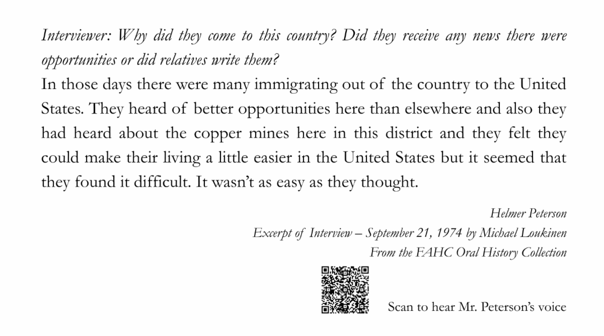 Highlighted alongside the art and archival artifacts of immigration are excerpts of oral history interviews from the FAHC Oral History Collection. These histories, digitized and available to researchers through the Finnish American Historical Archive website, allow visitors to immerse themselves in the firsthand experiences of immigrants and their descendants. Interim Gallery Director Clare Zuraw sees these stories as an important part of this exhibit.