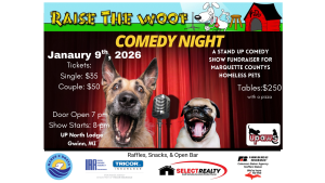 The Upper Peninsula Animal Welfare Shelter is excited to announce Raise the Woof, a comedy night fundraiser to support homeless pets in the community. Taking place on Friday, January 9, 2026, at Up North Lodge & Banquet Center in Gwinn, the event promises a night of laughter and fun for a great cause.