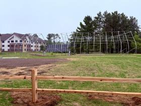 A portion of the Woodland Park site, with the relocated solar array (formerly near the athletic complex) in the back, and the frame for the Hoop House (formerly outside Jacobetti).